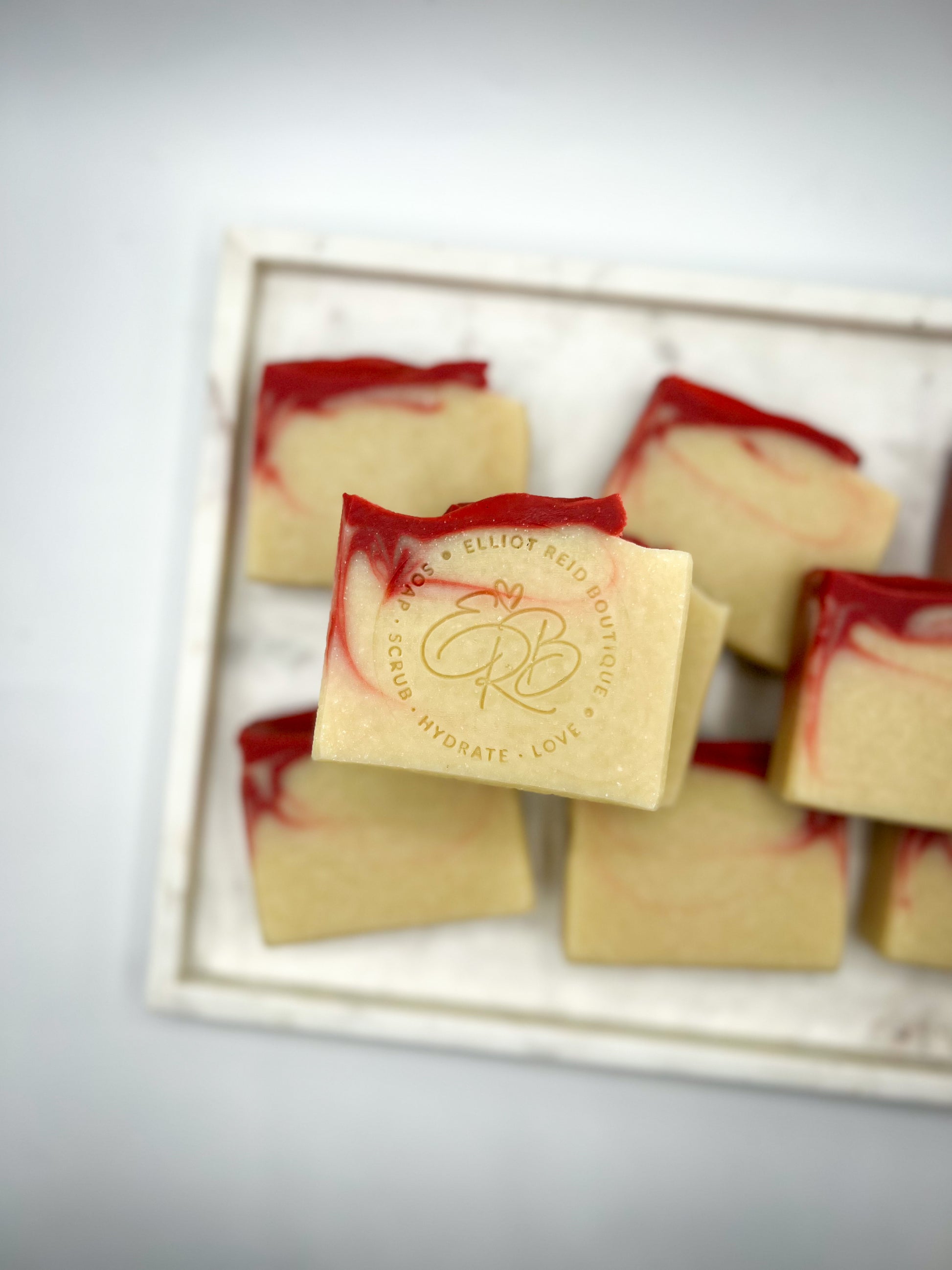 Ingredients include: Saponified Oils of Olive Pomace, Coconut, Distilled Water, Coconut Milk, Cocoa Butter, Avocado, Fragrance