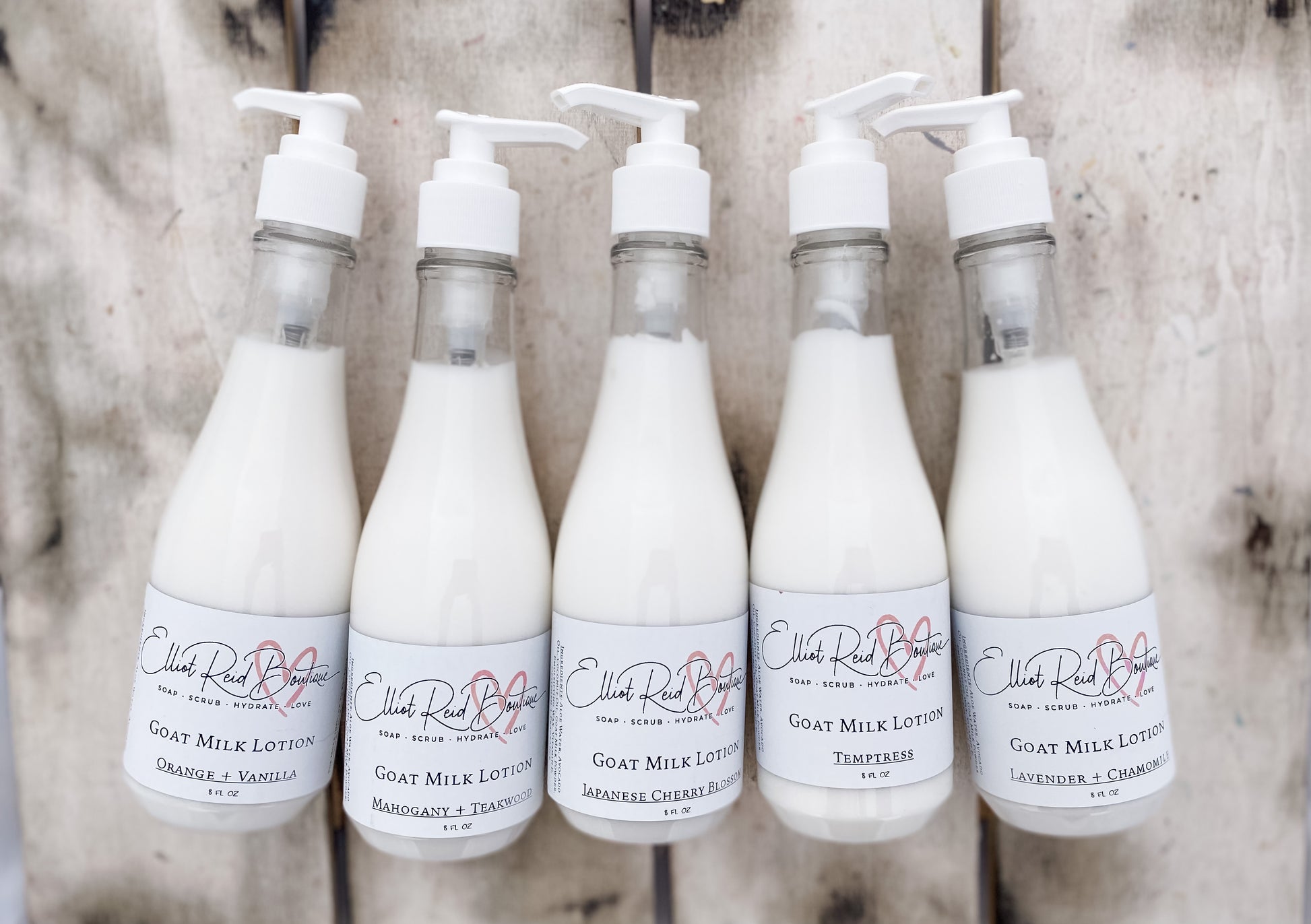 Aloe Water, Coconut Oil, Avocado Oil, Vitamin E Oil, Kokum Butter, Optiphen (preservative), + Emulsifying (conditioning) wax, Goat Milk Powder, + Fragrance or Essential Oils