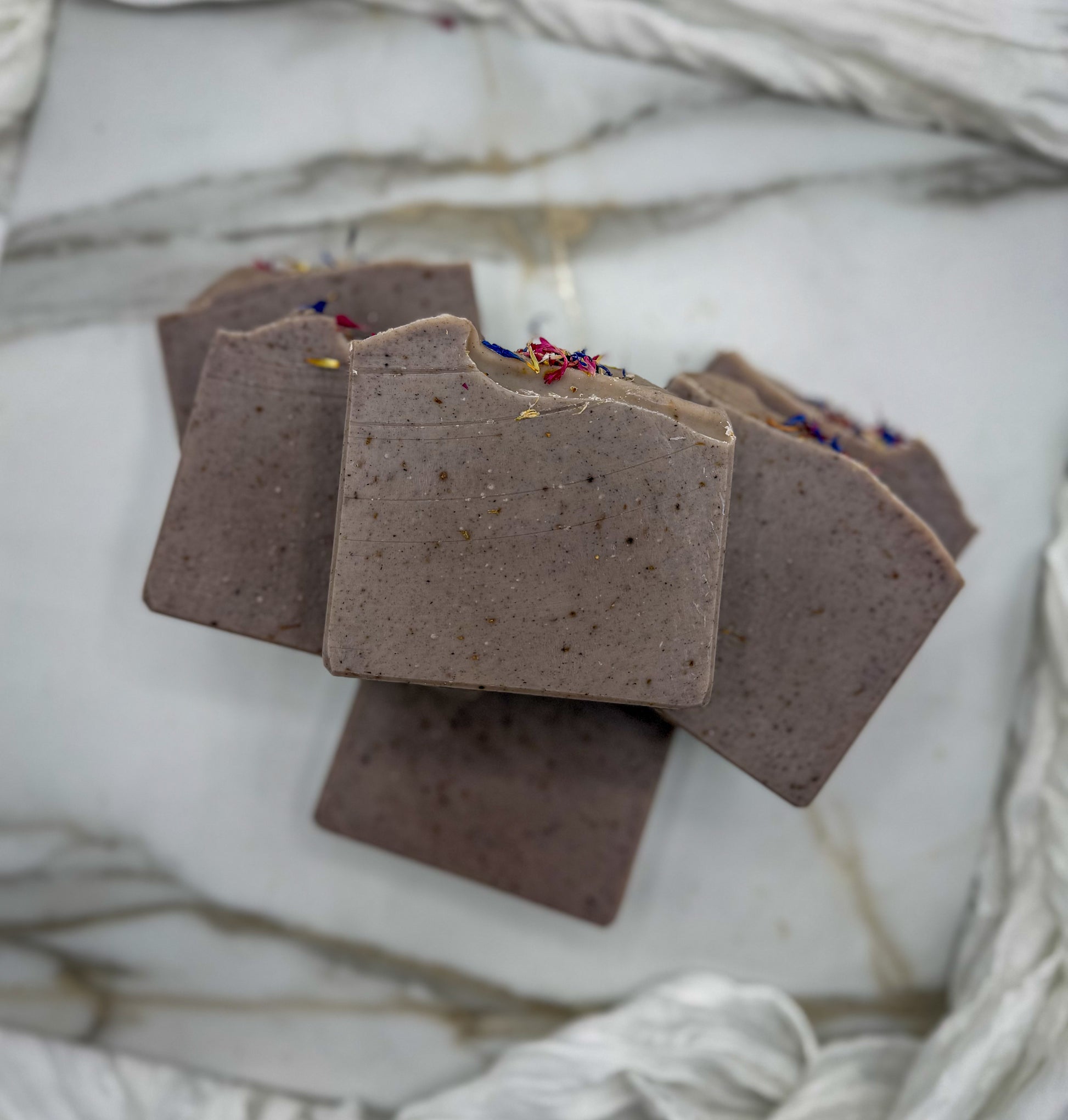 Ingredients include: Saponified Oils of Olive Pomace, Coconut, Distilled Water, Raw Goats Milk, Kokum Butter, Avocado, Kaolin Clay, Lavender Essential Oil, Purple Brazilian Clay and Red Sandalwood Powder (for color)